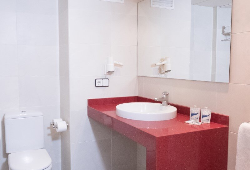 Link to Photo15, un baño con una encimera roja y un inodoro